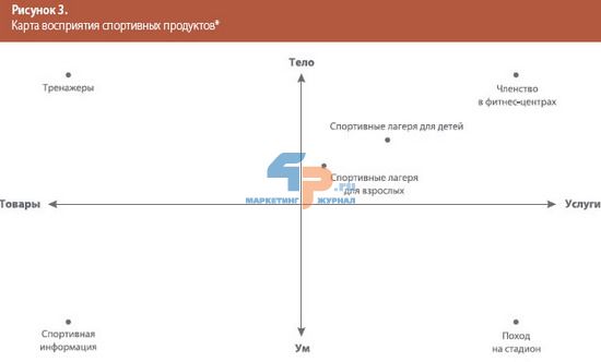 К сожалению, сложность спортивных продуктов делает классификацию по принципу «товар – услуга» не совсем корректной. К спортивным продуктам можно отнести все: от хоккейной шайбы до матчей Национальной академической атлетической ассоциации по баскетболу. Но если добавить к этому критерию классификации еще один, «тело – ум» (он базируется на утверждении, что одни спортивные товары влияют на тело потребителя, а другие – на его ум), можно построить карту восприятия спортивных продуктов (рис. 3). Спортивные маркетологи должны осознавать, в какой части этой схемы располагаются их продукты. Это поможет им понять, как воспринимают продукты потребители, и определить, на каких преимуществах следует сосредоточить внимание в рекламной кампании.